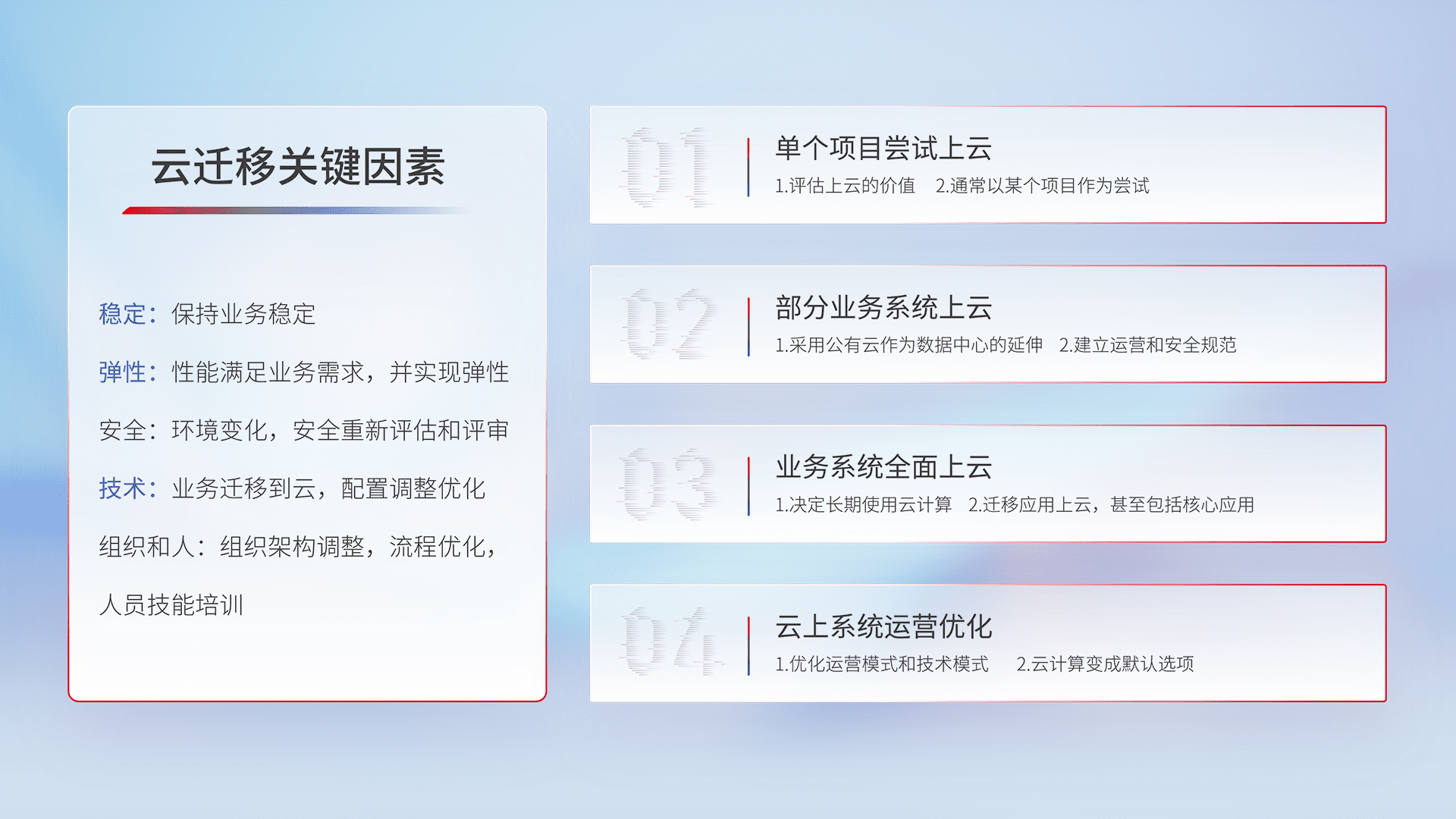 结合实际业务,,,,从规划设计、、云平台选型、、、云原生改造、、、、数据迁移、、、、集成交付,,迁移全过程为客户识别最佳上云路径,,,做好风险识别管理,,设计网络架构、、、身份权限、、、、安全审计合规、、、、操作审计、、日志审计、、、、监控告警策略、、多站点容灾设计等,,,,对云上基础设施进行整体规划,,提升IT治理水平,,,以满足弹性、、、、高可用、、、高性能的需求。。。。