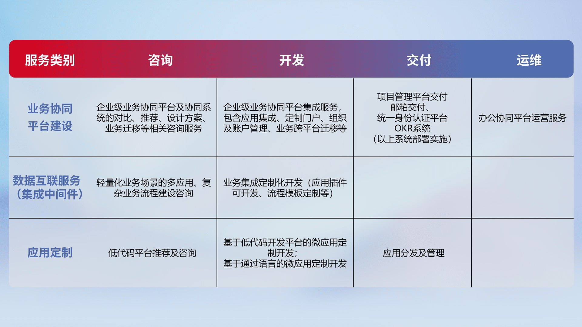 针对钉钉、、、、企微、、、IDaas等平台级产品提供产品的规划、、、方案、、、交付、、、、定制化开发等服务,,,实现如统一协同办公、、、、智能客户服务、、、混合会议管理、、、智能数据查询、、、等业务场景,,,实现数字化转型。。。。
